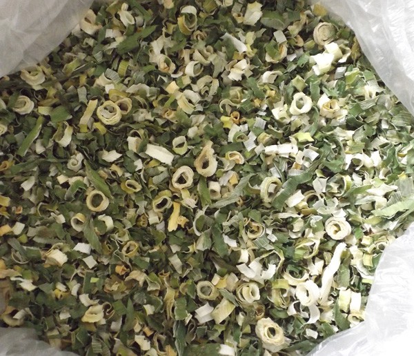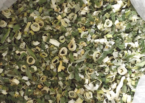 烘干:將甩干的蔥段攤放在烘篩中,裝在烘車層架上,送入干燥機烘干。干燥機在未進料前先行預(yù)熱升溫達60℃左右。烘干溫度控制在58~60℃,烘干時間6~7小時。產(chǎn)品含水量降到5%以下。